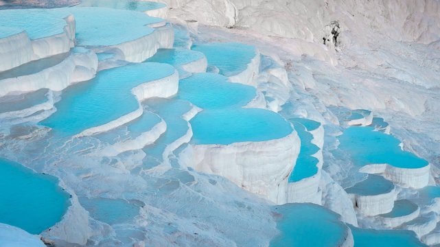 Pamukkale: Relax in the natural thermal pools of Pamukkale and admire the breathtaking views of the cotton-like terraces.